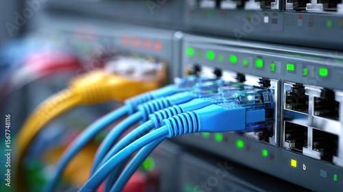 Naklejka premium Network cables plugged into switch with status lights blinking in server room