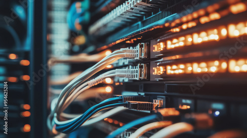 Naklejka premium Network equipment with interconnected wires, including network switches and...