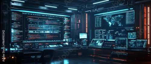 Fototapeta premium Network hacking console with interactive data visualization, realtime breach monitoring, and hightech security bypass tools in a futuristic lab