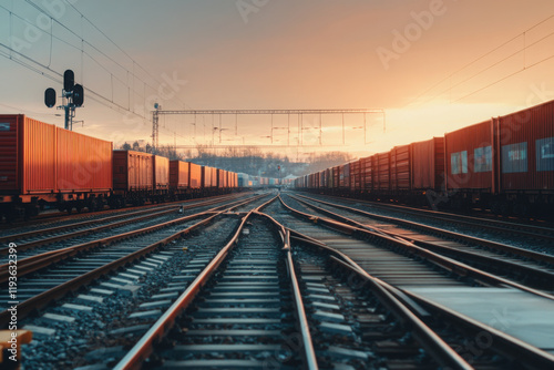 Fototapeta premium Network of commodity exchanges connecting freight trains during sunset in a...
