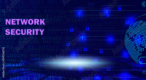 © Stock iT, Obraz premium Network security technology background with padlock icons and binary code for cyber protection web banner