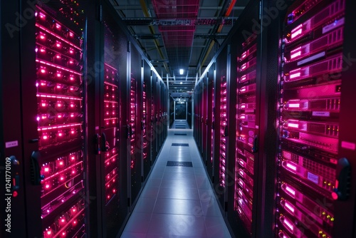 © juliars, Fototapeta premium Network server room with bright pink lights is housing server racks