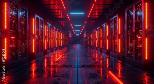 © PLUT_OFF, Fototapeta premium network server room with computers for digital communications and internet,abstract data concept, Cryptocurrency mining rig room