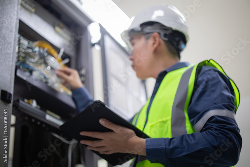 © JD Studio, Obraz premium Network technician wearing safety helmet and reflective vest performs LAN patchpanel inspection using tablet in server room with focused attention and professional care