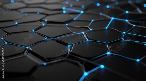Naklejka premium Networking-themed backdrop featuring light gray hexagons with glowing blue edges, connected by intricate lines, on a sleek black background.