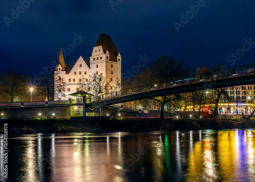Naklejka premium Neues Schloss und Bayerisches Armeemuseum mit Donausteg und Wasserspigelung in der Donau bei Nacht, Ingolstadt, Oberbayern, Bayern, Deutschland
