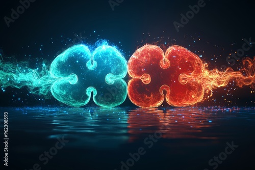 © Leo Rohmann, Obraz premium Neurocognitive interaction Neuroethics Neon lit fluid brains merging representing the dynamic energy and constant evolution of human thought and innovation