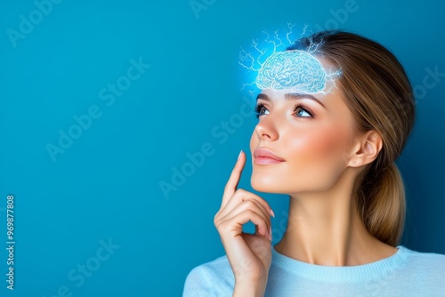 © Leo Rohmann, Obraz premium Neurogenesis neural interface data visualization mind mapping and innovation matrix silhouette of a woman with glowing brain patterns symbolizing mental clarity creativity and focus