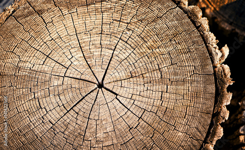 Fototapeta premium Neutral brown tree rings textured surface with cracks. Round large tree trunk...