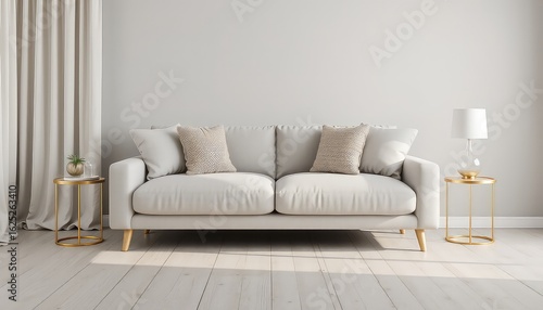 © MaeOnline, Fototapeta premium Neutral Toned Interior Design Featuring a Cream Sofa with Accent Pillows and Gold Side Tables Complimented by Soft Natural Light