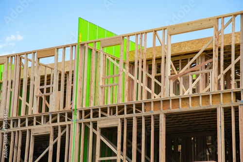 © Victor, Obraz premium New apartment building under construction on sunny day plywood frame facade
