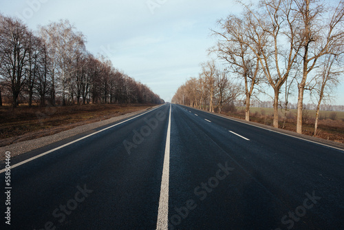 © levenko, Fototapeta premium New asphalt road with markings and road signs in the sun's rays