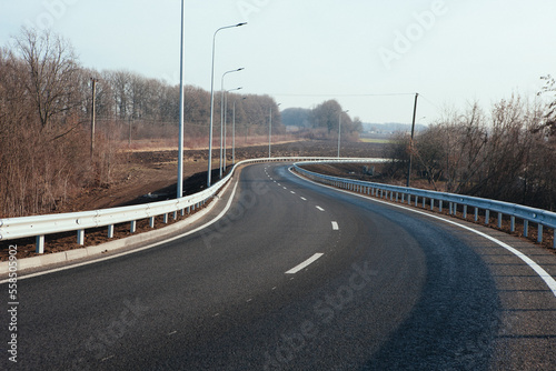 Fototapeta premium New asphalt road with markings and road signs in the sun's rays