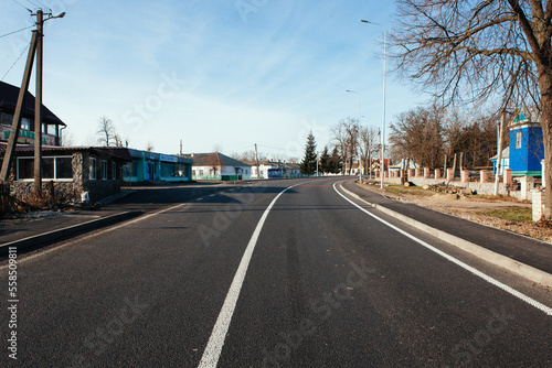 © levenko, Fototapeta premium New asphalt road with markings and road signs in the sun's rays