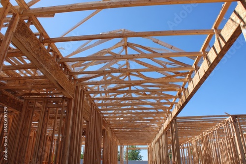Obraz premium New construction framing shows progress at a residential building site in bright sunlight