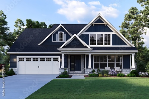 Obraz premium New Craftsman-style cottage home with white trim, front yard with green grass...