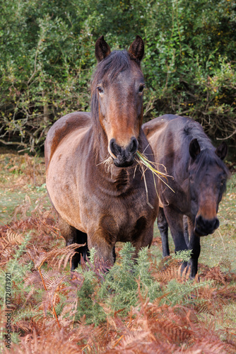 © Andrew, Obraz premium New Forest pony eating grass on Cadnam Common, Hampshire, England with companion grazing behind. Wild ponies roam freely in their natural habitat among autumn bracken and gorse bushes.