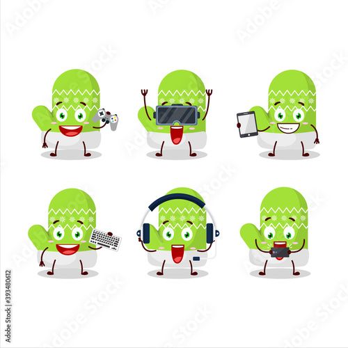 Obraz premium New green gloves cartoon character are playing games with various cute emoticons