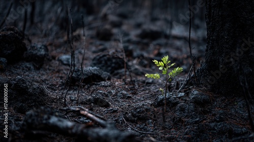 © paisorn, Fototapeta premium New Growth Emerges in Charred Forest After Wildfire Devastation