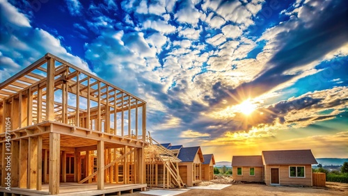 © Adisorn, Fototapeta premium New Home Construction: Wooden Beams Against a Blue Sky - Stock Photo