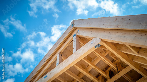 © Vector point, Obraz premium New Home Construction: Wooden Frame House Under Blue Sky New wooden house frame in progress, construction site, open sky, light background