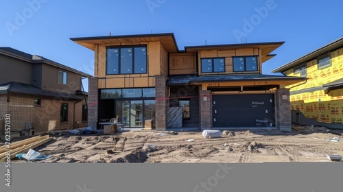 © rimsha, Obraz premium New home exterior under construction.