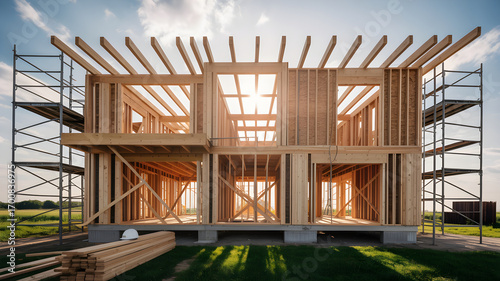 Obraz premium New home wooden frame construction with scaffolding at sunset