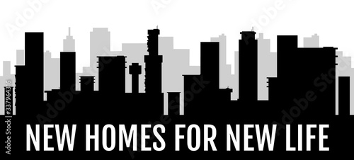 © IMG visuals characte, Fototapeta premium New homes for new life black silhouette banner vector template. Construction company horizontal poster monochrome design. Modern city, metropolis skyline 2d cartoon shape with typography