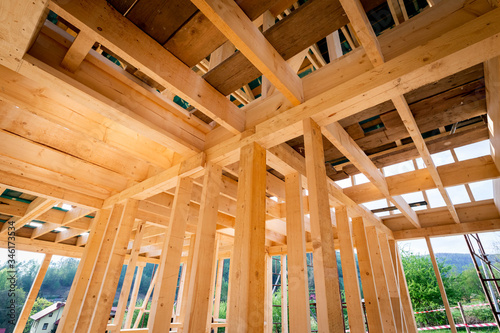 © leszekglasner, Fototapeta premium New interior residential wooden construction house framing