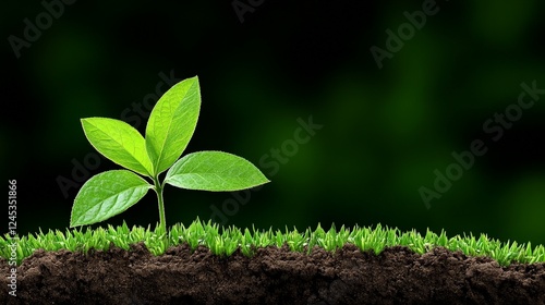 Naklejka premium New Life in Green: A vibrant green sprout emerges from the rich, dark soil, with lush grass surrounding it, against a background of varying shades of green.