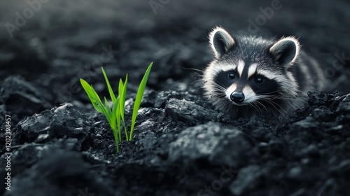 © Nima, Fototapeta premium New Life Sprouting After Fire - A young raccoon observes new green shoots emerging from scorched earth, symbolizing resilience, rebirth, hope, wildlife, and nature's tenacity.