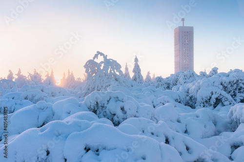 Obraz premium New Lookout tower in the shape of pentagon, Velka Destna, Orlicke mountains, Eastern Bohemia, Czech Republic Beautiful winter landscape with frosty trees in Eagle mountains, it si 150km from Prague.