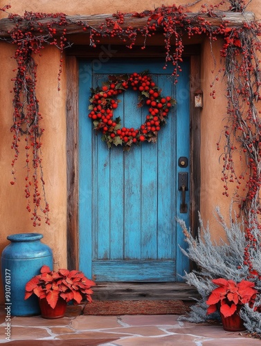 Fototapeta premium New Mexico Chile: Festive Door Decorations in Santa Fe for the Holidays