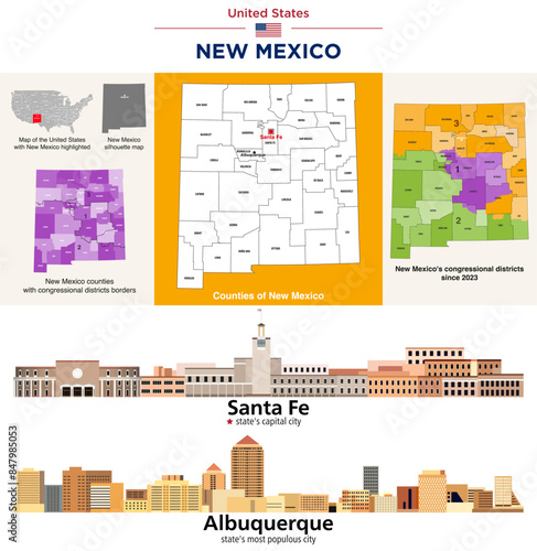 Obraz premium New Mexico counties map and congressional districts since 2023 map. Santa Fe (state's capital city) and Albuquerque (state's most populous city) skylines. Vector set