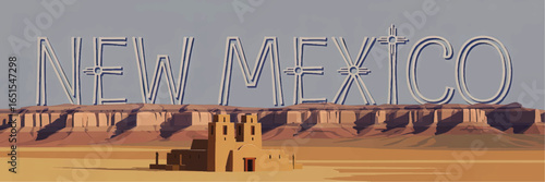 Obraz premium New Mexico Desert Landscape Illustration with Pueblo Adobe Church, Mesas, and Zia Symbol in Southwest Colors for Travel Promotion