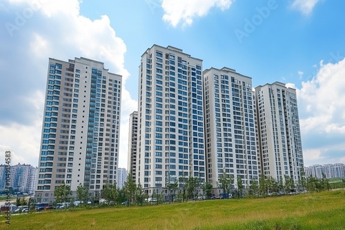 © Fathor, Fototapeta premium New modern block of flats in green area. residential apartment with flat buildings exterior. luxury house complex. Part of City Real estate property, condo architecture.generative ai
