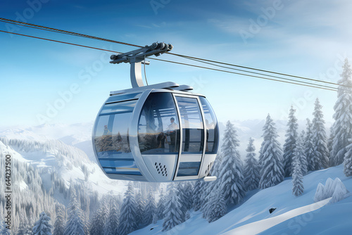 © dinastya, Obraz premium New modern cabin ski lift gondola against snowcapped forest tree and mountain peaks in luxury winter resort. Winter leisure sports, recreation and travel.