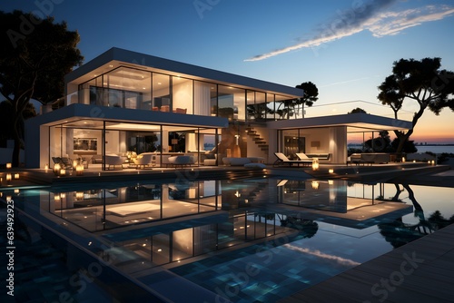 © kanishka, Obraz premium New Modern Villa with Pool: Luxury Living and Sundown Views