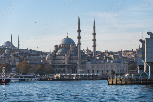© Extraded, Fototapeta premium New mosque on a sunny day, Eminonyu district, Istanbul, Turkey. View from Galata Bridge