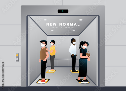 © Akira 54, Obraz premium New normal lifestyle in Elevator. People keep social distancing and wearing Medical mask for prevent coronavirus standing on footprint sign for stand in lift. Vector illustration.