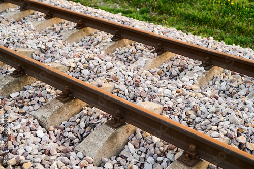 © barytek, Naklejka premium New railway rails on sleepers at a freight railway station