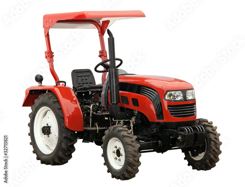 © Andrey Bandurenko, Obraz premium New red tractor isolated over white. With clipping path.