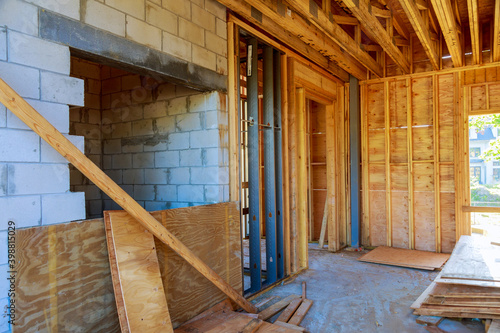© ungvar, Fototapeta premium New residential home framing interior view construction new house