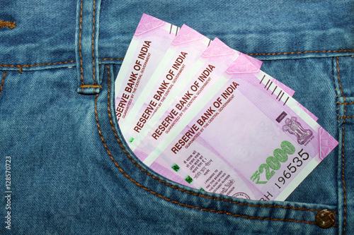 © anubhabroy, Obraz premium New 2000 rupee notes in an Indian mans jean front pocket.