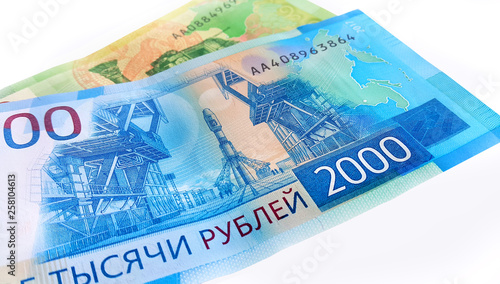 © Dinadesign, Obraz premium New Russian money, close-up, isolated on white background