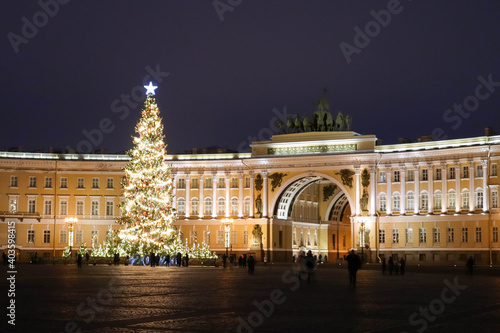© Sergei Timofeev, Fototapeta premium New year and christmas decoration with tall and beautiful fir tree on the Palace square of Saint Petersburg in Russia