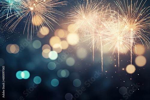 © Wuttichai, Fototapeta premium New year and xmas in style. Bright and festive holiday party with sparkling dazzling lights. Capturing magic of christmas. Night of joyful celebration with glowing lights and colorful fireworks