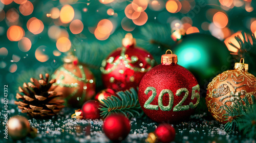 © yanapopovaiv, Naklejka premium New Year background for poster, calendar, Christmas tree decorations with numbers 2025, bokeh from garland, copy space