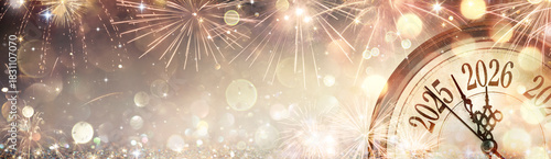 © Romolo Tavani, Obraz premium 2026 New Year Card - Clock And Fireworks Waiting Midnight - Abstract Defocused Background