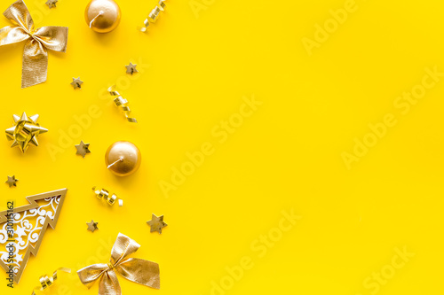 Fototapeta premium New Year card with tree, balls, present box on yellow background top-down frame copy space